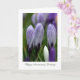 A imagem mostra crocus variegados roxos e brancos na Primavera, começando a desabrochar. Fresca e representando novos começos, esta é uma ótima carta de cumprimentos de Primavera.