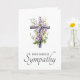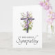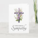 Belo cartão de compaixão com uma pintura aquosa de flores roxas numa cruz cristã, e o texto "Com a maior simpatia" na frente. Texto personalizado dentro: "Lamentamos muito sua perda. Pode encontrar paz e conforto durante este período difícil?
