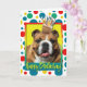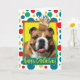 Celebre um aniversário com este Cartão de Saudação do Bulldog. Com um cupcake balanceado na cabeça, este design pode trazer um sorriso e risadinhas! BTW, Este design tem várias versões, com diferentes cores de fundo. Há também um convite para uma versão do Partido.