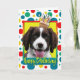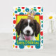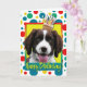 Comemore um aniversário com este cartão inglês brilhante de saudação de cachorro Springer Spaniel. Com um cupcake balanceado na cabeça, este design pode trazer um sorriso e risadinhas! BTW, Este design tem várias versões, com diferentes cores de fundo. Há também um convite para uma versão do Partido.