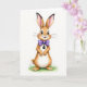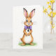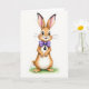 This design shows an upright, human-like bunny centered in the scene, looking straight out with big dark eyes that catch the light 🐰. Its warm reddish-brown fur fades into a creamy belly and a small pale tail, giving it a soft, storybook look. Fine whiskers and tiny lashes frame its face, with a pink nose and a little tongue peeking out as if it’s mid-giggle at a close friend. Around its neck sits an oversized violet bow that feels like a gift-ready touch, drawing attention to the bunny’s tender, welcoming pose 🐇. Hanging from the bow is a glossy, teardrop-shaped black pendant that adds a dressy contrast to the gentle fur tones. The background stays simple, with no extra scenery, keeping the focus on the character’s direct gaze and sweet expression. There is no text on the front, leaving open space around the bunny for the artwork to stand on its own. A small patch of green grass rests beneath its feet while the rest of the backdrop remains plain and light.