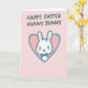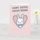 This card features a plump white rabbit character peeking up from a large heart near the lower middle, with a sweet, friendly expression 🐰. The rabbit’s rounded cheeks show a rosy blush, and its wide eyes and tiny tongue give it a teasing look, like it’s sharing a private joke with someone close. A small sky-blue bow tie sits under its chin, tying in with the teal outline of the heart. Inside the heart is a soft rosy pink fill dotted with small white polka dots, adding gentle texture. The background is a light pastel pink wash that keeps the scene soft and springlike 🌷. Across the upper area, chunky green text is placed in a loose, hand-drawn style, standing out clearly against the pink backdrop. The teal heart outline frames the rabbit’s face and ears, with the polka-dotted pink interior tucked neatly behind it.