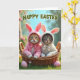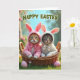This card shows two small cats cuddled close in a rustic woven basket, dressed in soft hooded outfits with long bunny-like ears 🐰. The left cat is a ginger tabby in a rosy pink outfit with a matching bow, leaning slightly toward its companion as if sharing a quiet, trusting moment. Beside it, a grey tabby with faint stripes wears a white outfit with a cream bow, their faces turned forward with wide green-gold eyes that feel gently inviting. Light falls across their fur and the fabric, bringing out tiny whiskers, fluffy cheeks, and the basket’s braided texture. Behind them, a softly blurred spring scene stretches out with green foliage and a clear blue sky, giving the couple a cozy little spotlight. Across the top, a cheerful holiday greeting appears in green lettering, centered like a header above their ears 🌷. In the grass at the bottom, two smooth pastel pink egg shapes rest near the basket.