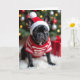 This holiday card features a lovely portrait of a cute black French Bulldog all dressed up for Christmas 🎅🏼🎄🎁. The dog wears a red and white sweater and a Santa hat with a fluffy white pompom. Its eyes are dark and soulful, shining with the light of the season. Against a cozy backdrop of soft lighting, the dog sits on a white shag rug, surrounded by hints of a Christmas tree and a red gift box. The scene is filled with warmth and festive cheer, making it perfect for spreading holiday joy to all who receive it.