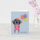 Um coala bonito, de uma roupa cor-de-rosa, com uma coroa rosa na cabeça, segurando três balões coloridos. O texto feliz aniversário é impresso no canto inferior direito do cartão.