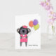 Um coala bonito, de uma roupa cor-de-rosa, com uma coroa rosa na cabeça, segurando três balões coloridos. O texto feliz aniversário é impresso no canto inferior direito do cartão.