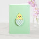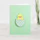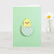 Designed with a calm pale green background, this card centers on a small yellow baby bird peeking out of a cracked egg, with big dark eyes and a tiny rosy triangle beak that feels like it’s looking up at you with friendly curiosity 🌷. A few short spiky tufts on its head add a sweet, bashful look, like it’s just been caught in a gentle moment. The lower half shows a white eggshell with neat crack lines and a repeating quatrefoil pattern, letting soft mint green show through the openings. Light shading around the cutout edges creates a subtle shadow, giving the shapes a layered, paper-cut feel. There’s no busy scenery, just open space that keeps the focus on the little bird’s tender, welcoming expression 🐇. Any greeting text would sit nicely above the character in a simple dark tone, with a smaller line tucked near the bottom for balance. The white patterned shell rests in the lower center, with mint green peeking through each small quatrefoil cutout.