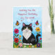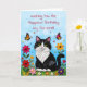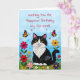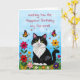 A cute cat pun filled birthday card for a friend. A sweet black and white tuxedo cat sitting in flowers and surrounded by butterflies. The art is in an impasto oil paper quilling style.