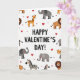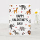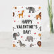 This greeting card features a white background with safari animals gathered around a sweet message. In the center, it says “HAPPY VALENTINE’S DAY!” in black, sans-serif block letters that are easy to read. Around the text, you’ll see gray elephants with rosy cheeks and calm expressions, plus giraffes with brown spots and gentle smiles. There are also golden-yellow lions with simple cartoon faces and black-and-white striped zebras peeking in from the edges. Some animals are fully shown while others are cropped at the border, which makes the layout feel like a friendly group surrounding the greeting. Small red hearts are scattered all over the card, adding a clear romantic touch ❤️💌🍫. Hope it helps you share kind, caring Valentine’s Day sentiments with someone special.