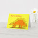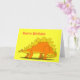 This cute birthday card has a cartoon orange and yellow Stegosaurus dinosaur on the front. It says, "Happy Birthday."