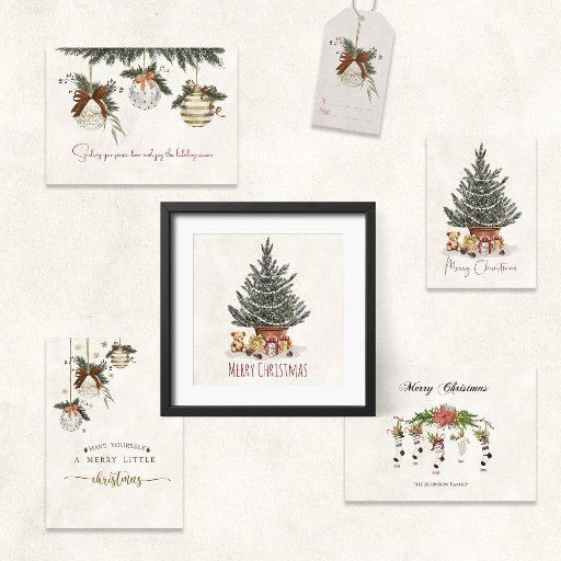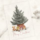 A Christmas card with a Christmas tree and a teddy bear surrounded with gifts.