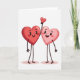 This card shows two cartoon hearts standing side by side on a plain white background. The heart on the left is a deeper red with a big smile and a soft blush on its cheeks, looking happy and calm. Next to it is a lighter pink heart that’s also smiling, with a thin dark arm lifted up. In its hand, it holds a tiny red heart like a sweet little gift. Both hearts have simple stick-like arms and legs, and their faces are easy to read and friendly. The lighting gives them a gentle shine, almost like candy, with a slight texture that keeps them from looking flat. There’s no text on the card, so the picture does all the talking ❤️