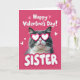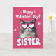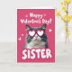 This greeting card shows a fluffy gray-and-white cat centered on a bright fuchsia pink background. The cat looks sweet and calm, with white whiskers spreading out and a small pink nose peeking out. It’s wearing fuchsia heart-shaped sunglasses with white lenses, which makes the whole scene feel extra loving and fun 🥰. Near the top, the text “Happy Valentine’s Day!” appears in rounded white letters with a thin pink outline, and a few tiny pink hearts float around it. Near the bottom, the word “SISTER” is written in white cursive-style lettering so it’s clear who the card is for. Small white heart icons are scattered around the cat, filling the space without distracting from the face. It feels meaningful because it mixes a cute animal with a direct message that says “I’m thinking of you,” especially for a sister you care about ❤️.