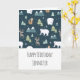 Birthday card with a whimsical rustic pattern. Polar bears, reindeers, trees. foxes, and snowflakes. On a dark green background.