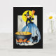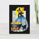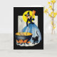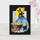 Vintage Halloween greeting featuring a pretty witch stirring her cauldron, while her black cat supervises.