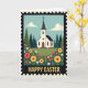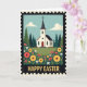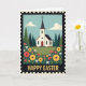 Este cartão de cumprimentos mostra uma cena da paisagem rural da primavera enquadrada como um selo postal antigo com pequenas perfurações nas bordas e uma textura levemente desgastada. No centro, há uma pequena capela branca com uma torre escura encimada por uma cruz e uma porta frontal vermelha que parece um convite aberto para que os amigos entrem juntos. Árvores de folhas perenes verde-escuras se agrupam ao seu redor, contra um céu azul calmo com nuvens arredondadas e suaves. O primeiro plano é um prado ondulado repleto de grandes flores amarelo-douradas, flores coral-vermelhas e pequenas flores brancas em forma de estrela, com toques extras de rosa e laranja espalhados entre 🌷. As cores são brilhantes, mas suavemente atenuadas, dando à cena um aspecto aconchegante e afetuoso, como se a paisagem estivesse se inclinando para dar as boas-vindas 🐇. Perto da parte inferior, as palavras “FELIZ PÁSCOA”