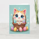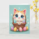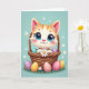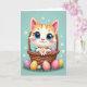 Na frente do cartão, um gatinho listrado de laranja em estilo animado com olhos azuis superdimensionados senta-se confortavelmente em uma cesta tecida, suas bochechas suavemente coradas enquanto olha para fora com um olhar terno e amigável 🌷. As pequenas patas do gatinho seguram uma margarida branca bem perto, como um presente quieto e especial oferecido a alguém 🐰. A cesta está recheada com ovos coloridos e manchados, e alguns rolaram para a grama verde abaixo, adicionando um clima casual e de momento compartilhado. Atrás da cena, um fundo azul pastel brilha com luz suave e é pontilhado com minúsculas flores brancas que flutuam como confetes de primavera. Perto do topo, uma curta saudação de Páscoa aparece em letras arredondadas, em branco com um contorno rosa claro para que se destaque contra o fundo azul celeste 🐇. A sombra sutil dá à pelagem e à textura da cesta uma profundidade suave, mantendo o visual geral leve e arejado