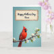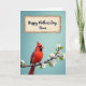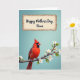 Este cartão apresenta um pássaro canoro vermelho impressionante com uma crista alta empoleirado em um galho florido no canto inferior esquerdo, como se estivesse pausado para compartilhar um momento tranquilo ❤️. Suas penas escarlates desvanecem em vermelhos mais profundos ao longo das asas e da cauda, e uma marca escura no rosto chama a atenção para seu olho vigilante, dando à cena um clima suave e atento. O fundo é um tom aqua calmo que parece ar de primavera aberto, mantendo o foco no pássaro e nas flores. Flores brancas com pequenos centros dourados pontilham o galho, com folhas verdes suaves ao redor delas, adicionando um toque fresco e afetuoso 🌼. Perto do topo, há um retângulo horizontal em uma cor de pergaminho quente, bordeado por uma borda marrom áspera que parece levemente desgastada. O texto de saudação está centrado dentro desse retângulo em tinta escura, em letras fluídas que se destacam claramente contra a faixa pálida. Sombreamento sutil e luz suave destacam a textura das penas e as pétalas delicadas