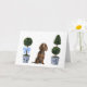 Estas placas de saudação apresentam um retrato de aquarela de um dachshund sentado entre dois topiários do estilo chinoiserie.