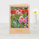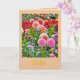NOTE CARD FEATURES LARGE, SHOWY DAHLIAS (MOSTLY PINK AND PEACH COLORED AMONG GREEN FOLIAGE; UNIDENTIFIED RED FLOWERS IN BACKGROUND). CUSTOMIZABLE TEXT ON FRONT, "HELLO". BLANK ON INSIDE FOR YOUR OWN MESSAGE.
