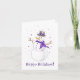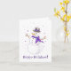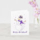 Um lindo cartão de inverno roxo e prata! Ilustração de uma alegre dama de neve vestida com um cachecol roxo elegante e um chapéu enfeitado com fita, aproveitando a magia do inverno. Pequenos flocos de neve em forma de coração roxo giram em torno dela; a mensagem "Felizes Festas" está inscrita abaixo dela. Em branco no interior.