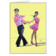 Pares dos dançarinos A do cha do cha do cha do convite da dança do cha do cha do cha dos dançarinos do salão de baile de Cha Cha Cha de dançarinos do salão de baile do cha do cha do cha. Uma menina que veste um vestido frilly do flouncy cor-de-rosa curto e uns calçados cor-de-rosa do salto alto. Um dançarino masculino com uma camisa de vestido cor-de-rosa e uns calçados pretos do calças e os pretos