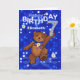 Um ursinho de pelúcia castanho e bonito com arco azul dançando através de luzes azuis e margaridas e segurando uma alegria como a número 7 é uma alegria de 7 para aquela garotinha especial em sua vida com seu nome na frente do cartão. Personalize o nome no verso frontal e dentro usando os modelos fornecidos. Design original do Anura Design Studio.