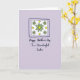 Este cartão de saudação apresenta um fundo lavanda pálido com um retângulo branco crocante centrado perto do topo, delineado em índigo profundo como uma moldura arrumada. Dentro dessa moldura, uma flor verde de seis pétalas com um centro amarelo ensolarado senta-se no meio, rodeada por quatro flores menores correspondentes que parecem companheiras próximas reunidas em um círculo suave. Entre as flores, quatro formas de diamante amarelo minúsculas adicionam um brilho arrumado e semelhante a uma joia que sugere um vínculo doce ❤️. Os contornos suaves e definidos mantêm tudo organizado, enquanto ainda permitem que as cores suaves sejam sentidas de forma terna e afetuosa. Abaixo do painel floral emoldurado, uma mensagem fluída em estilo manuscrito em azul escuro estende-se pela metade inferior, colocada como a linha principal de texto. O contraste entre a letra índigo profunda e o fundo lavanda claro torna as palavras fáceis de notar sem sobrepor a arte 🌼. O painel emoldurado é centrado acima do texto, com espaçamento uniforme ao redor