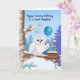 This charming January birthday card showcases a beautiful Snowy Owl holding a snowflake balloon while sitting beside a rich chocolate birthday cake. In the background, a small Barn Owl watches from a snowy winter scene, adding a touch of nature and seasonal magic. Perfect for anyone with a January birthday who loves owls, wildlife, and cozy winter themes, this unique nature-inspired birthday card brings charm, warmth, and winter wonder to their special day.