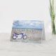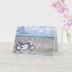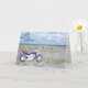 Um motociclo azul em pé numa praia com nuvens fofinhas no céu. Feliz Aniversário escrito em rocha refletido na água que deita na areia.