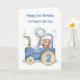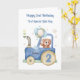 Este cartão de 2º aniversário é adequado para um neto ou filho. O design inclui balões de aniversário aquarela e um trator azul e verde com um ursinho dentro.
