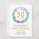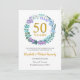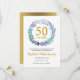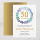 Este Cartão de Anúncio de Save the Date para o 50º aniversário de casamento apresenta uma delicada grinalda de flores e folhagens feita de campainhas azuis, plantas e flores de lilás. Pode ser facilmente personalizado com as informações da renovação de votos de ouro especiais. O verso do convite apresenta as datas de aniversário em texto branco elegante sobre fundo dourado.