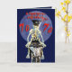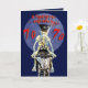 Um motoqueiro esqueleto andando de porco e fumando um cigarro. Dentro é uma fotografia de um crânio e um verso assustador. Um cartão de aniversário muito assustador.