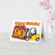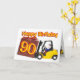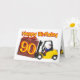 Uma empilhadeira segura uma parcela com a idade nela inscrita em letras amarelas brilhantes. Um cartão de aniversário alegre e engraçado para um homem.