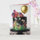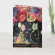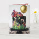 Cartão de aniversário com extravagante bolo de chocolate com flores de glacê e balão dourado.