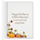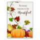 Cartão de saudação mostrado com uma bonito folha de outono e um impressão de colheita de abóbora com um dentro de saudação de Ação de Graças. Personalize este cartão ou comprar como está.