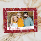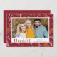 Elegante cartão com fotos de Ação de Graças com sua foto favorita da família emoldurada em branco com um fundo de folhagem laranja, branca e burgundy. "Obrigado" é apresentado num estilo moderno de fontes burgundy. Personalize a frente da placa adicionando seus nomes, o ano ou outro texto. O moderno cartão de Ação de Graças reverte para apresentar sua mensagem pessoal (opcional) em texto branco com fundo burgundy.