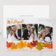 Este lindo cartão de anúncio de casamento com foto de Ação de Graças apresenta uma elegante colagem de 3 fotografias sob as palavras laranjas Nós Fugimos. Esta bonita fotografia de folhas de outono com madeira branca na moda atrás das folhas é um cartão de Natal chique para decorar com suas fotos de recém-casados. Agradeça por seu novo casamento com essas fotos de casal fofo.
