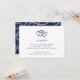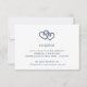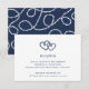 Cartão de acompanhamento da recepção de casamento estilo costeiro romântico com os detalhes da sua recepção (horário, local e endereço) em azul marinho clássico, encimado por um par de corações de corda náutica enodados em azul marinho.