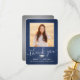 Envie um bilhete elegante de gratidão com cartões de agradecimento personalizados de formatura, em azul-marinho, prata e branco, com 2 fotos. Todas as imagens e textos são fáceis de personalizar. (DICA DE COLOCAÇÃO DE IMAGEM: Uma maneira fácil de centralizar uma foto exatamente como você deseja é cortá-la antes de fazer o upload para o site da Zazzle.) Este modelo pode ser personalizado com qualquer texto de sua escolha, como planos de educação futura, nova posição no emprego ou citação inspiradora favorita. Se preferir escrever à mão sua mensagem, simplesmente exclua o texto de exemplo ou use o espaço acima do novo endereço e informações de contato. O design apresenta um fundo azul escuro de aço inoxidável falso, um boné de formatura em fólha metálica falsa, caligrafia em estilo manuscrito, tipografia minimalista moderna e duas fotos de sua escolha, como fotos de formatura ou imagens da cerimônia de formatura. Por favor, note que a cor prata é impressa, não é fólha metálica. Estes cartões personalizados e elegantes são uma maneira moderna e sofisticada de agradecer a familiares e