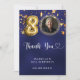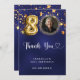 Um cartões de agradecimentos de 80 aniversário. Uma cor azul de fundo do marinho. A cor azul é irregular. Com estrelas douradas falsas. Na frente: número 80 escrito com uma fonte no estilo do balão. Adicione sua foto. Obrigado, seu texto, título e uma data. Voltar: Personalize e adicione seu nome e nota de agradecimento.