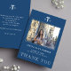 Modelo moderno elegante de cartões de agradecimentos de graduação da escola de enfermagem, azul e branca, com sua foto e texto personalizados.