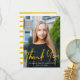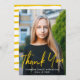 Cartões de agradecimentos de graduação moderno com a foto do formando com "Obrigado" em letras amarelas do script de pincel. Personalize a frente do cartões de agradecimentos de graduação de fotos adicionando o nome do formando e o ano de graduação. A parte traseira da placa apresenta espaço para o seu obrigado datilografado ou manuscrito com um fundo listrado amarelo e branco.
