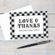 Um cartão de agradecimento de casamento ousado e rústico com uma borda xadrez preta e branca emoldurando letras maiúsculas rústicas "Amor e Agradecimento" com os nomes do casal totalmente editáveis em uma elegante escrita abaixo. A tipografia casual e festiva e o padrão clássico xadrez tornam este cartão uma escolha natural para um casamento de I Do BBQ no quintal, jantar de ensaio ou chá de casal. Todo o texto é totalmente editável para personalizar seu cartão. O interior do cartão dobrado está disponível para uma nota manuscrita ou mensagem impressa personalizada.