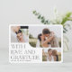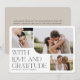 Um casamento elegante, graças a vocês, as cartas mostram um trio de fotos de casamento em formas orgânicas arredondadas para um visual moderno. "Com amor e gratidão" aparece no canto inferior esquerdo em letras serif embelezadas, com seus nomes embaixo. Adicione uma mensagem pessoal e uma assinatura ao verso.