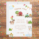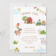 Agradeça aos convidados do aniversário maravilhoso com este lindo cartão de agradecimento com tema de fazenda, apresentando um celeiro, balões coloridos, bandeirolas e ilustrações adoráveis de um cavalo, vaca, porco, pato e galo. Perfeito para um menino ou menina que ama animais, este cartão pode ser personalizado com seu próprio texto. Itens correspondentes disponíveis.