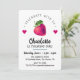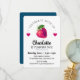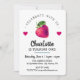 CONVITE DE ANIVERSÁRIO DE MENINA COM MORANGO E CORAÇÕES EM FUNDO BRANCO E VERSO AZUL ESCURO.