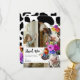 Cartão de agradecimento de aniversário temático de Vaca Sagrada. O design apresenta um fundo com estampa de vaca preta e branca, um arco de foto branco, duas vacas fofas com adornos florais coloridos e ousados em aquarela e uma mensagem divertida de agradecimento moo.