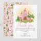 Este cartão de agradecimento de aniversário fofo e feminino apresenta um castelo encantado cor-de-rosa mágico, com um príncipe, princesa e flores. O design mágico perfeito para o aniversário do seu filho!