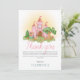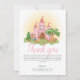 Este cartão de agradecimento de aniversário fofo e feminino apresenta um castelo encantado cor-de-rosa caprichoso, com um príncipe, princesa e flores. O design mágico perfeito para o aniversário do seu filho!
